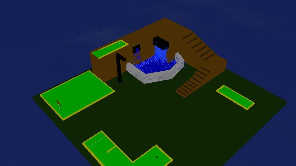 This mini golf course was 3D modeled in Maya, and also features the use of a particle system to represent a waterfall in the small pool are beside the ramp to go up to the hole on top of the course.